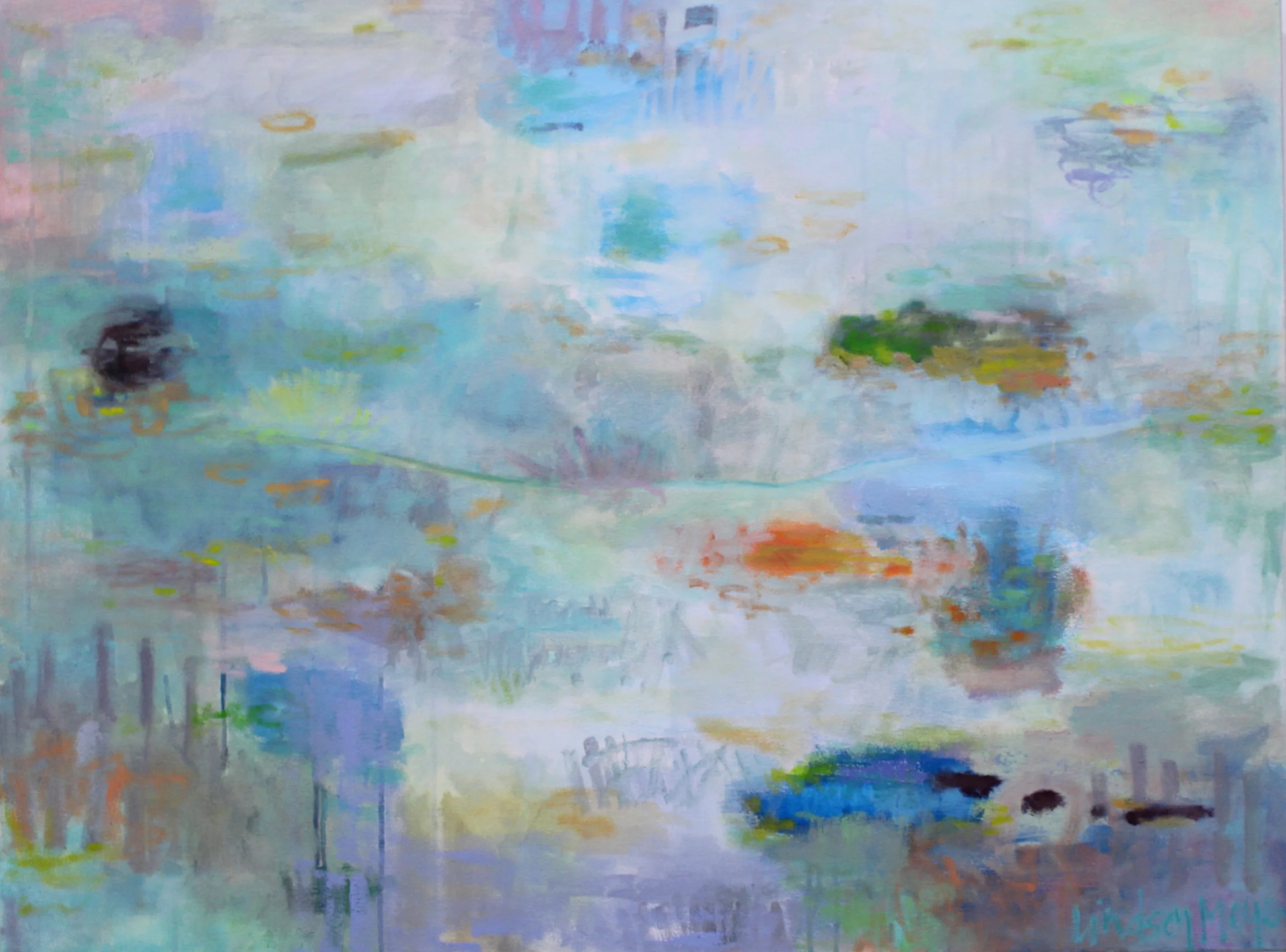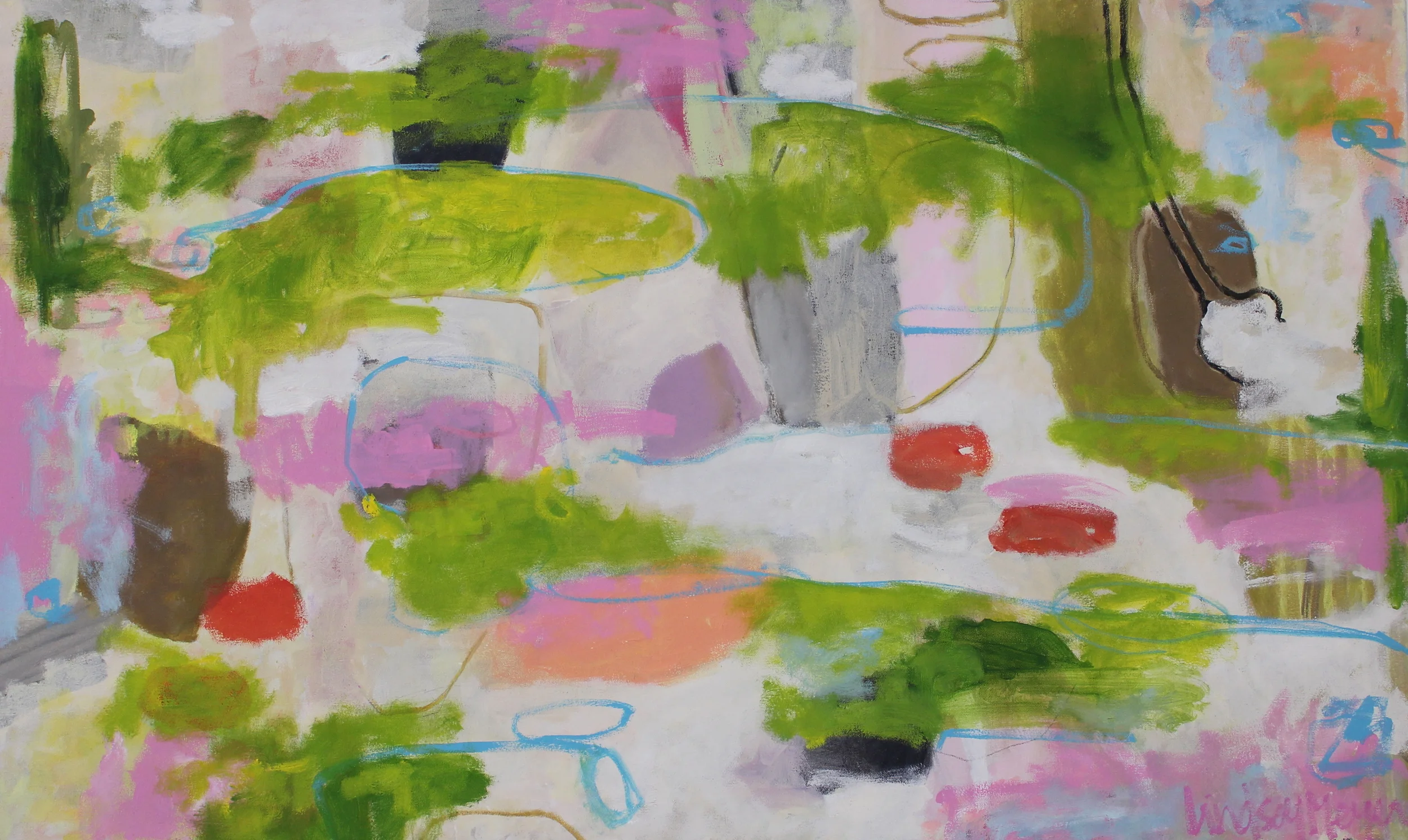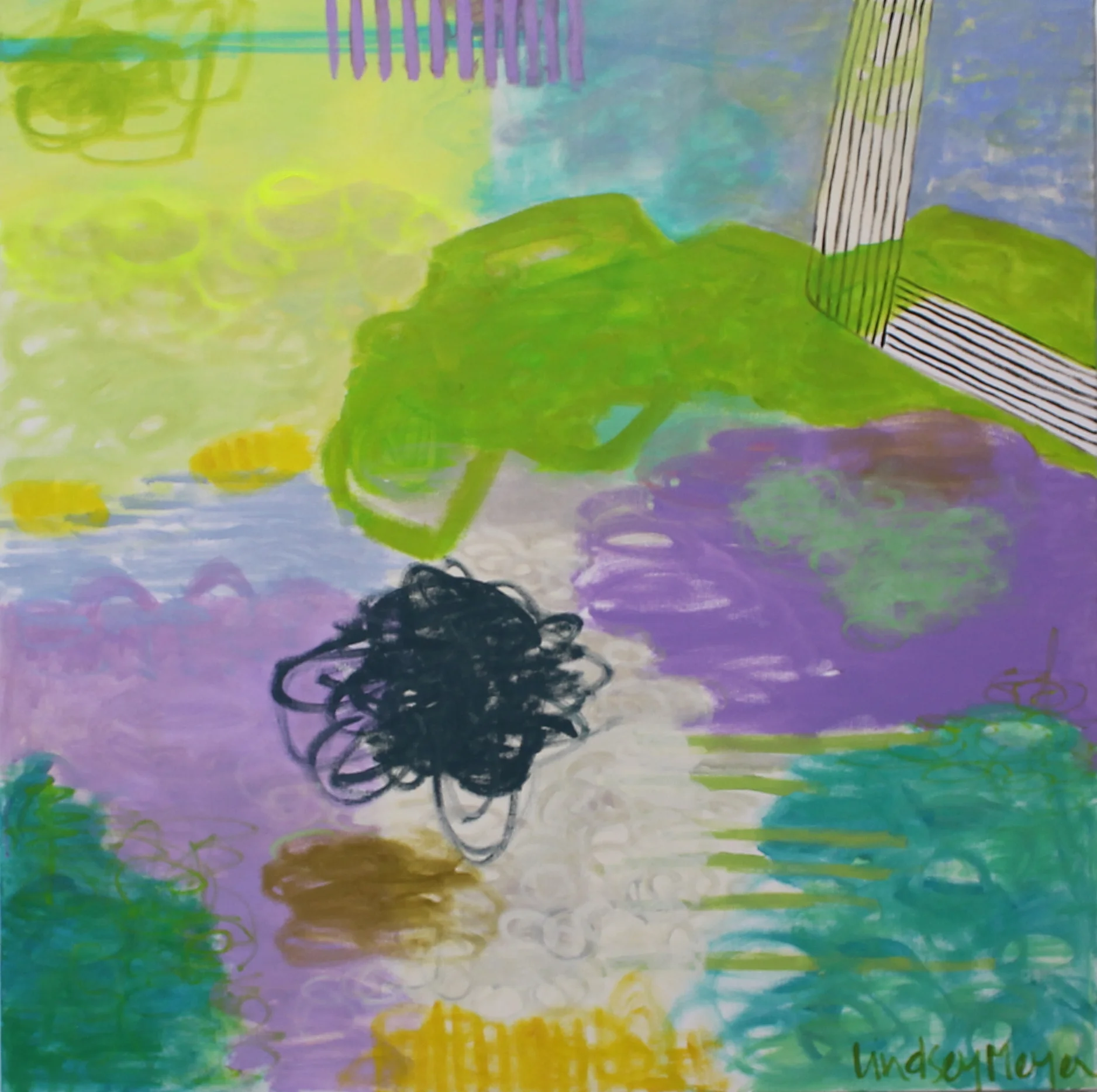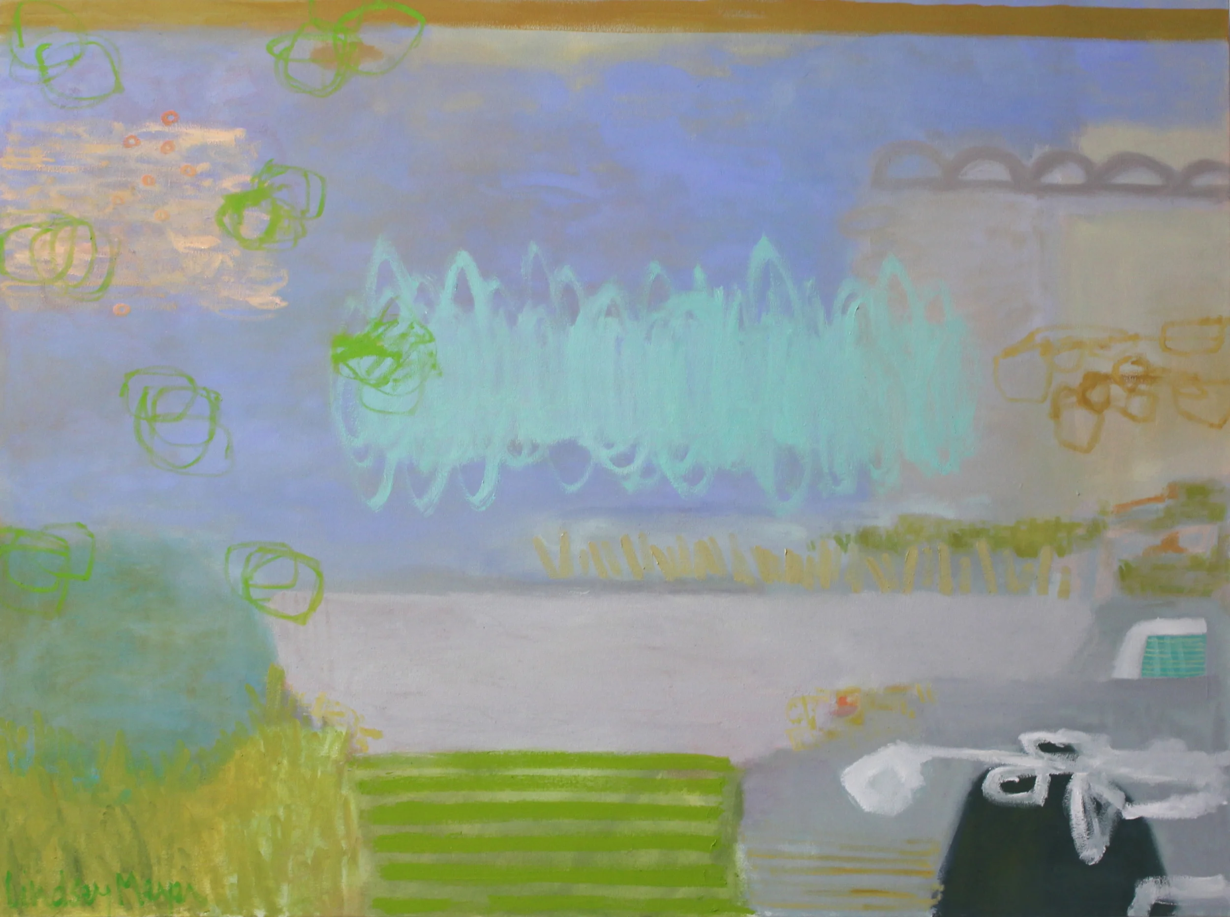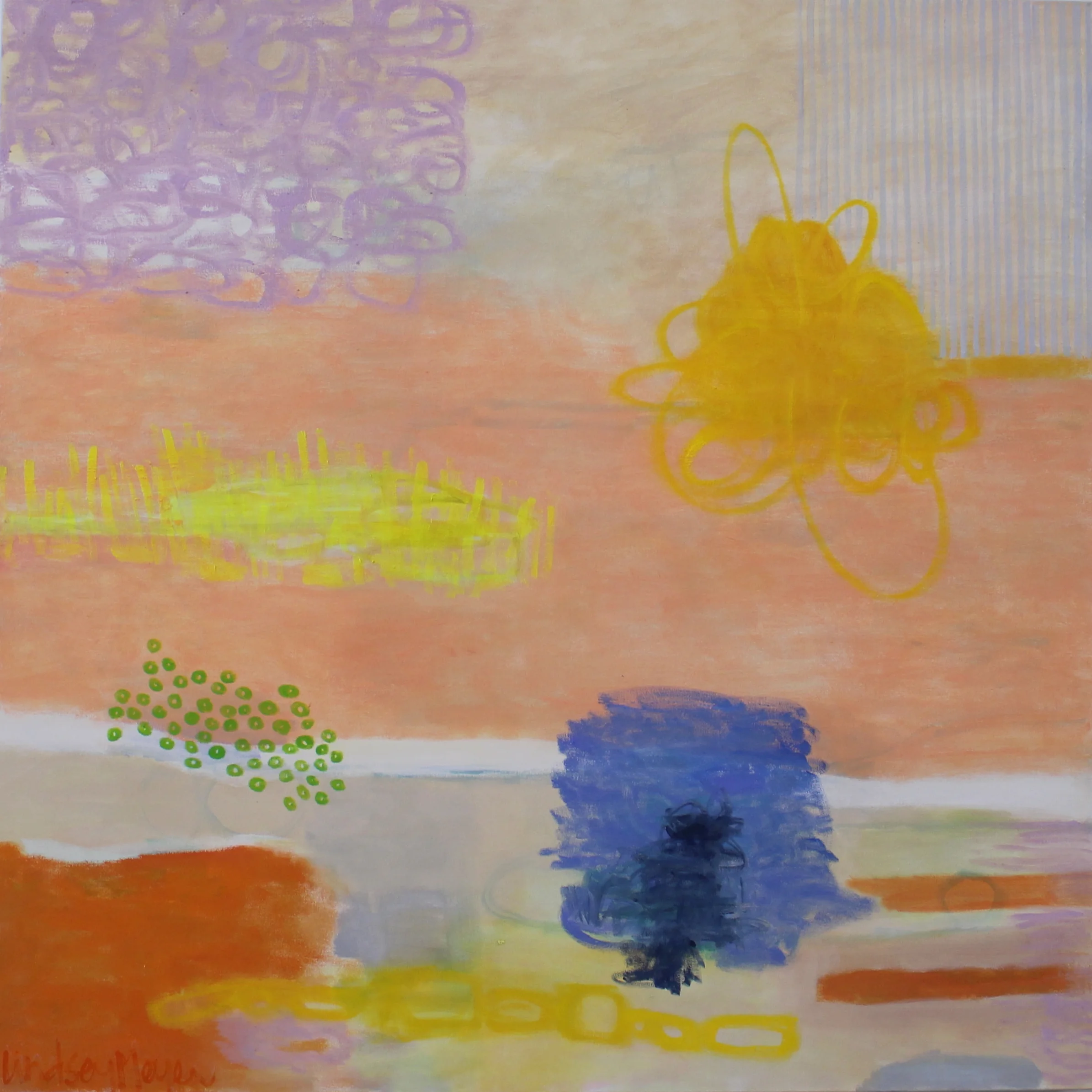 Although working mostly in oil, Meyer often transitions into multi-media works, acrylic and watercolor. Her paintings are alive with rich color, texture, and movement, valuing these aspects are more important than a recognizable image. Fashion, interior design, and textiles are her main source of inspiration, finding that her roots in apparel and visual arts have had much influence in her paintings.