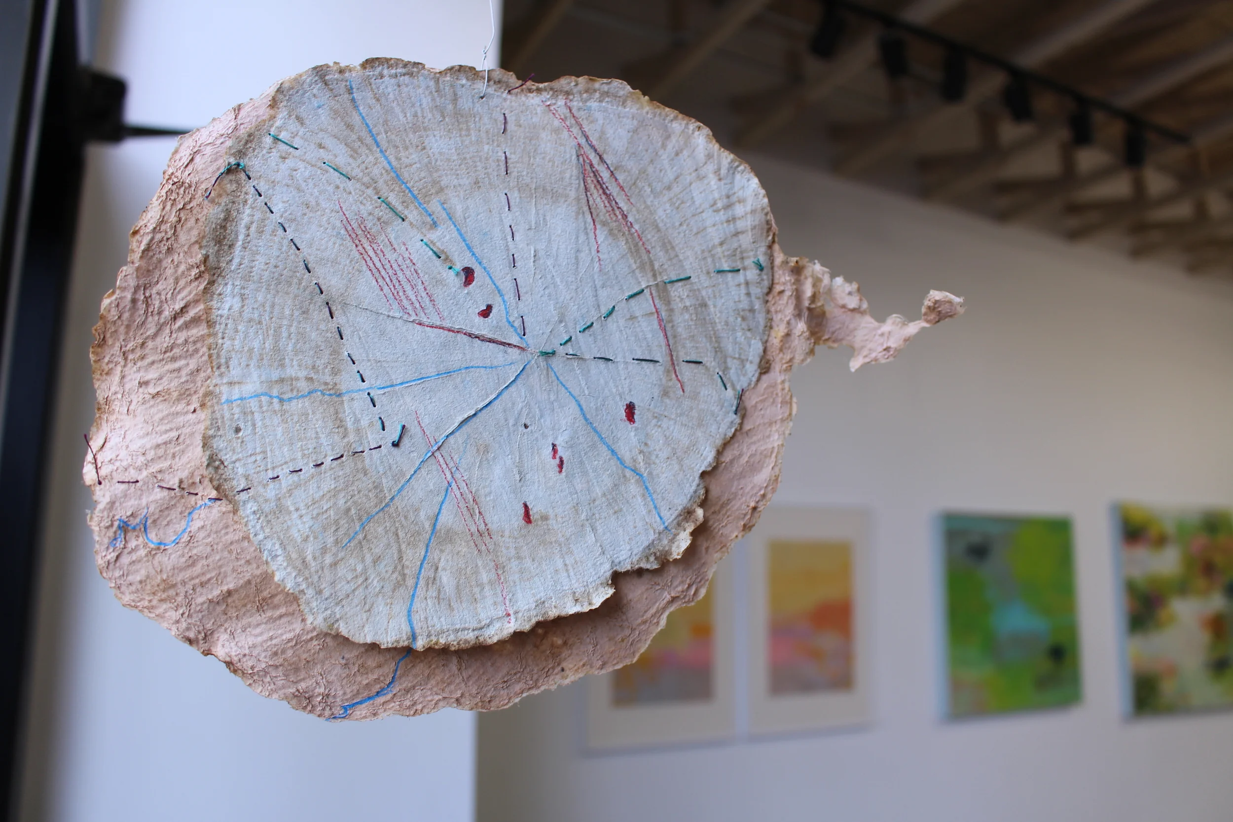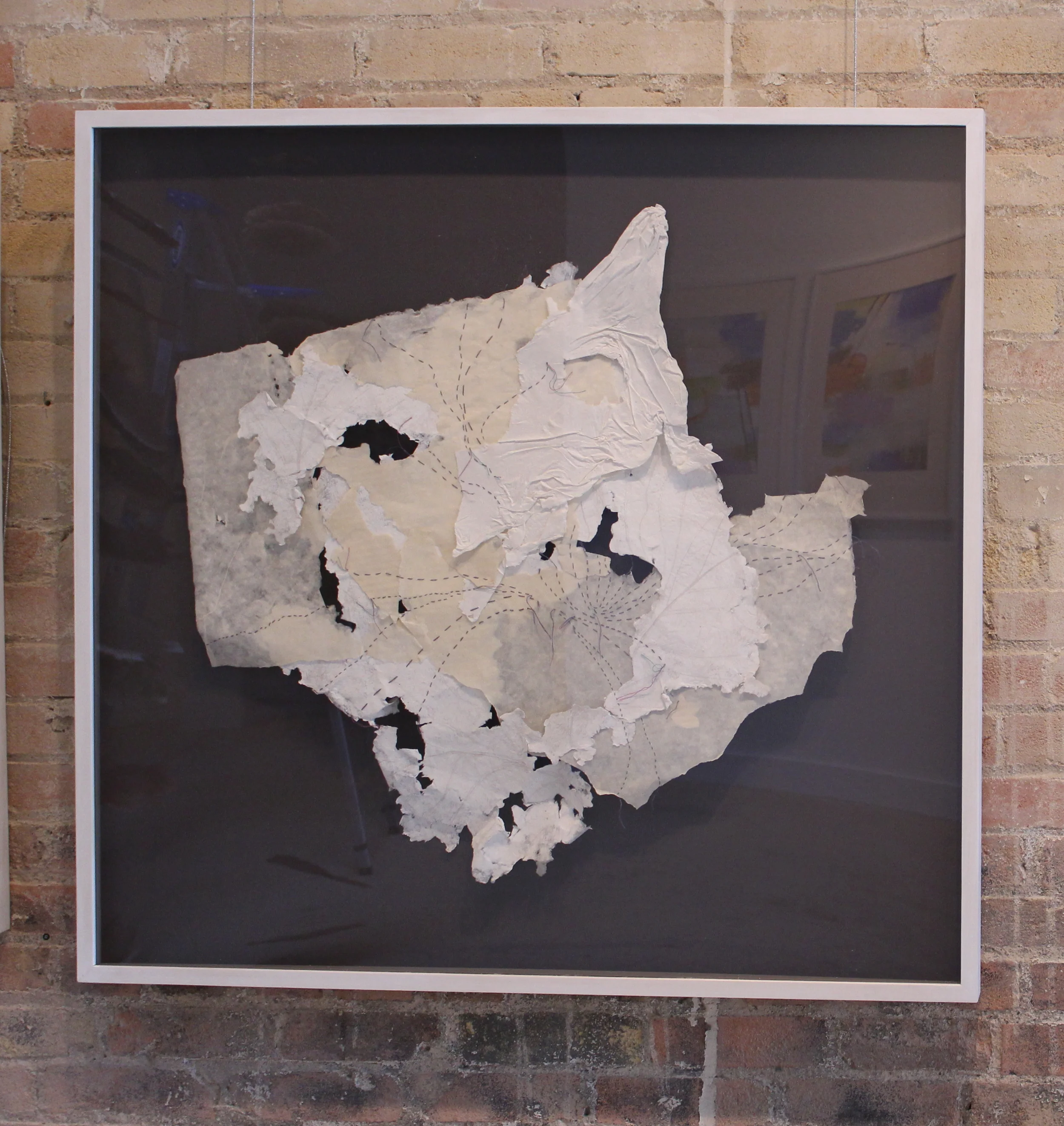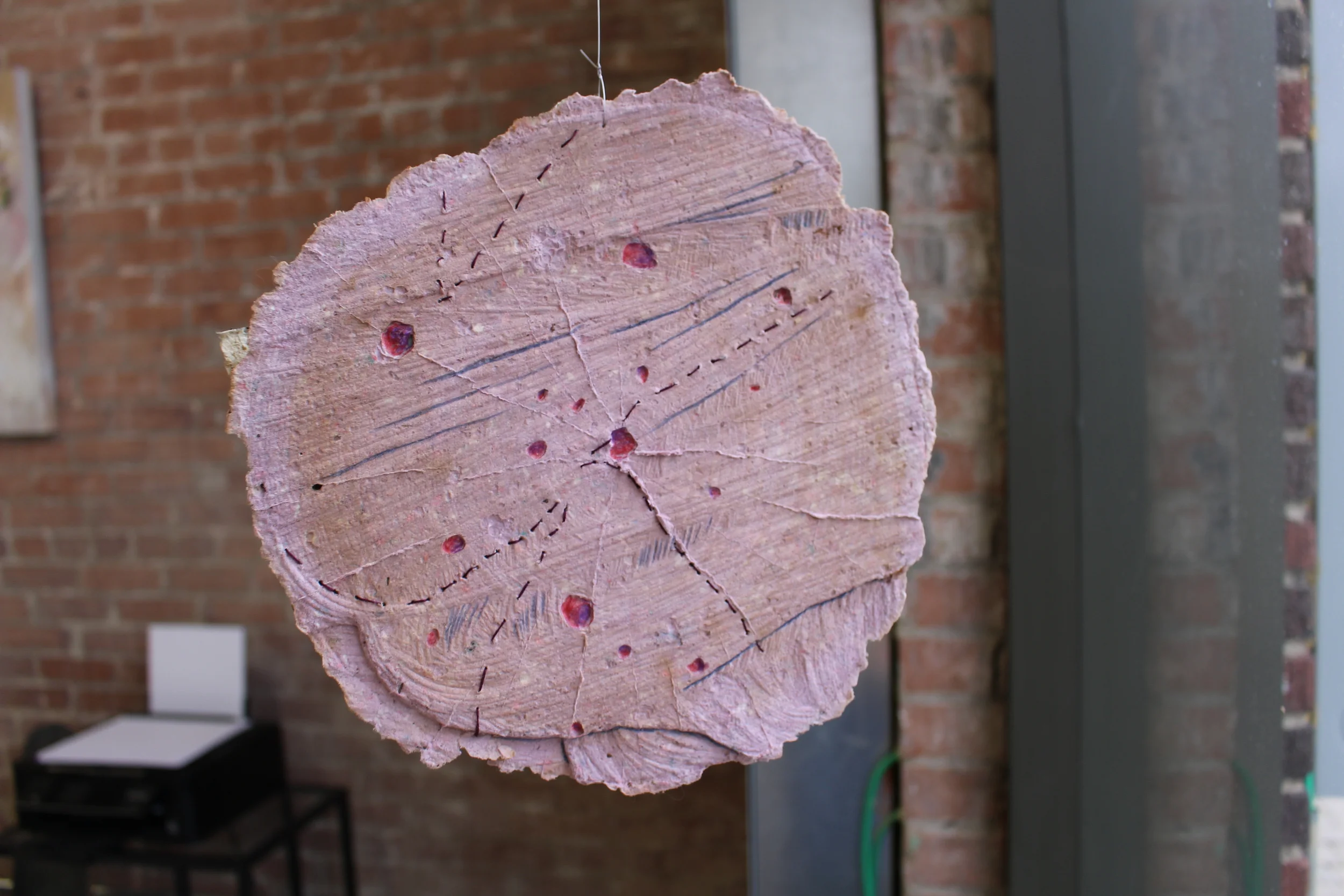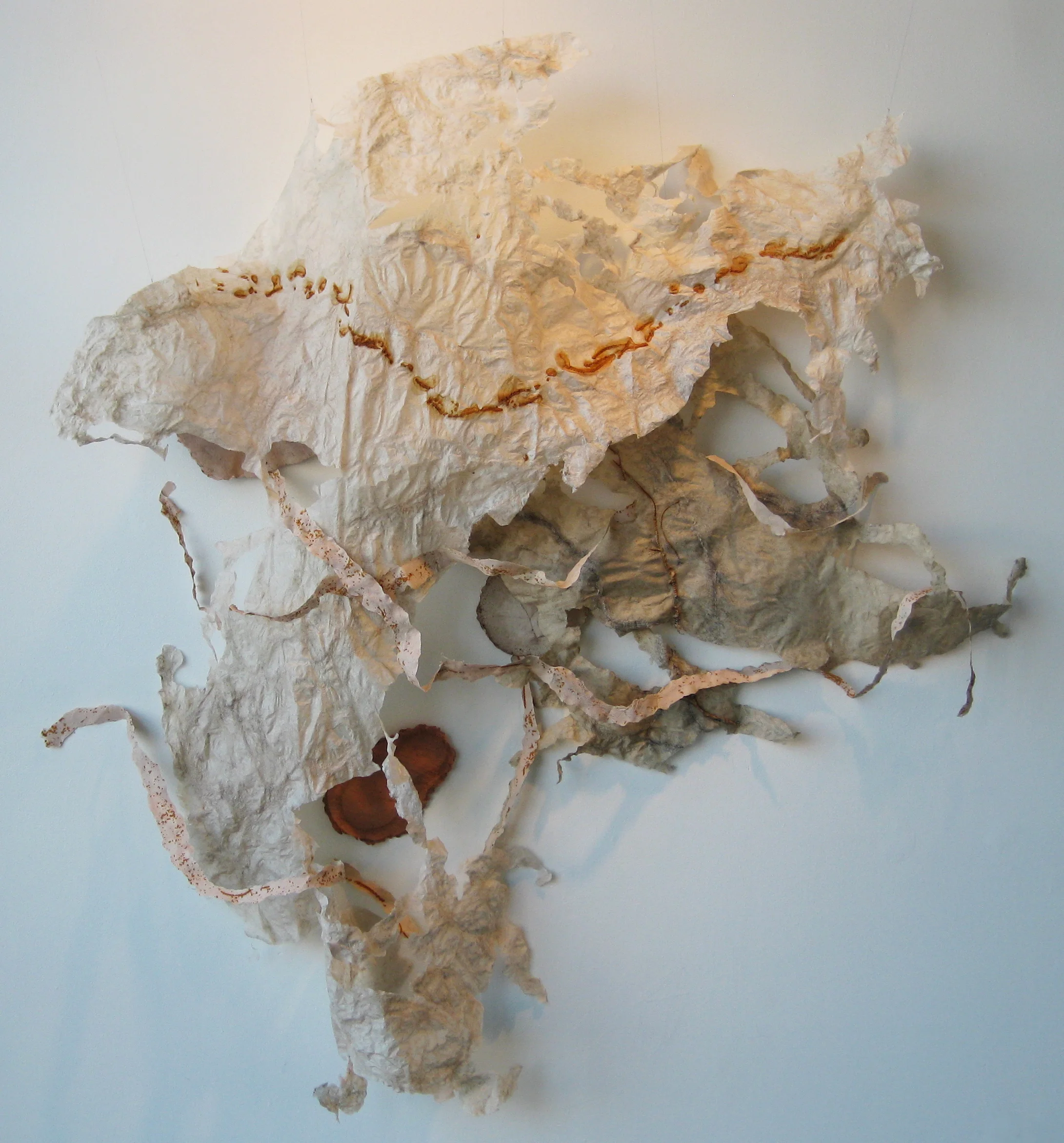 Papermaking is the central process to all of Sarah's pieces. "I am able to manipulate the size, shape, and texture of the paper. I can choose to form it into flat sheets or draw with the wet pulp to create layers for my sculptures," says Sarah. The prints incorporate drawings and layering of maps of places that are significant to her life. She looks at the detailed lines of topographical maps and plays with thickness and texture of the ink with which she prints. Sarah's work becomes increasingly abstract wight he use of paper and pulp as she maps ideas and things, not just actual places.